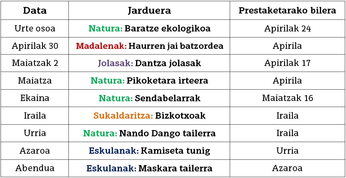 Apirilaren 24a (urteko prestaketa saioa): BARATZE ekologikoa. Arramendiko baratzeetan urte bateko ibilaldiaren ostean jarduerarekin nola jarraitu (talde berrien osaketa, zer landatu erabaki, komunikazioa nola landu…) erabakitzeko bilkura. Datozen egunetan bidaliko dira deialdi honen inguruko informazio gehiago.