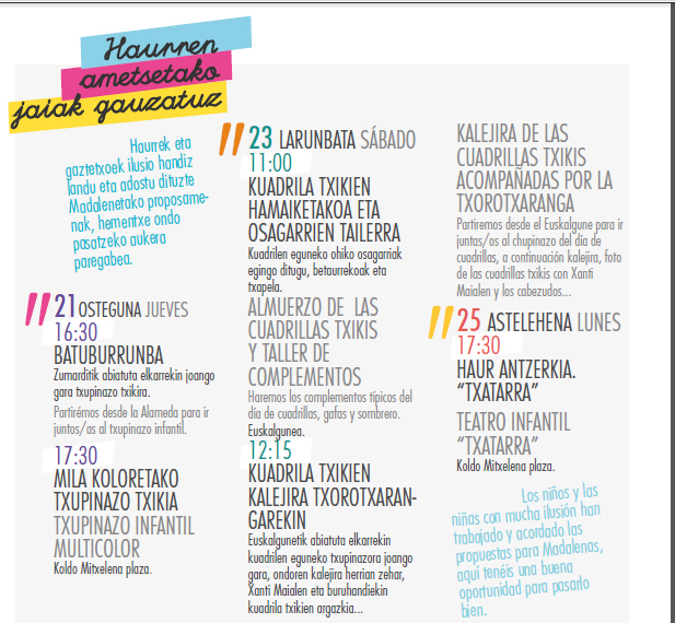 Bestelako ekintzak: uztailaren 21ean arrasaldeko 4:30etan Gamon Zumarditik Batuburrunbadara Esmalteria plazaruntz aterako da. Perkusio instrumentuak eskuz egiteko gida hemen. Koloretako txupinazo txikia Esmalteria plazan 5:30etan.