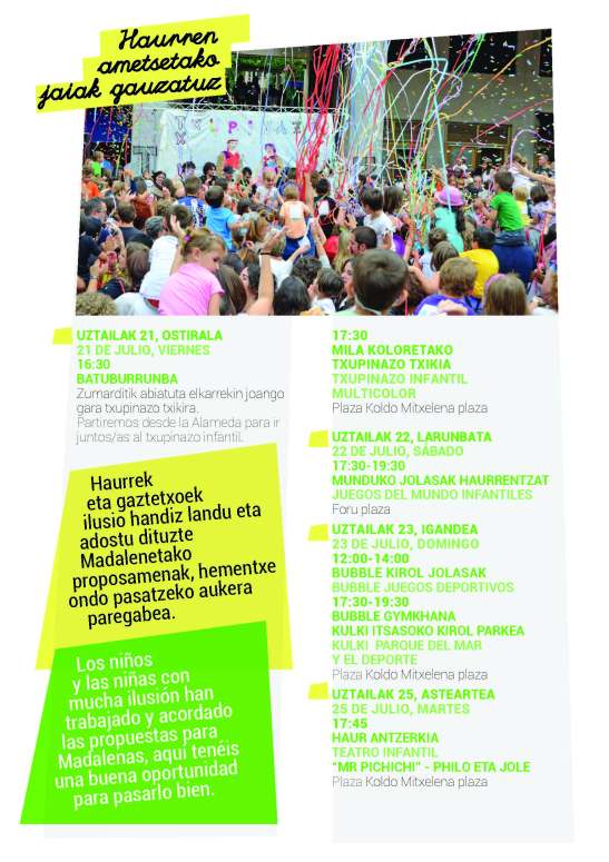 16:30etan Gamon zumardian Batuburrunba: Gamon zumarditik abiatuta, Koldo Mitxelena plazara (Esmalteria) joango gara, Zo Zongo perkusio taldeak lagunduta. Perkusio instrumentuak material birziklatuekin egitea proposatzen zaizue familioi. Hemen instrumentuak egiteko gida txiki bat. Batukadan erabilitako intrumentuek ere erabili daitezke.