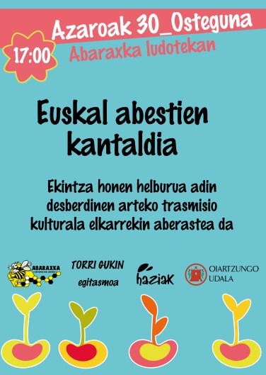 Oiartzungo adineko herritarren aisialdia, gizarteratzea eta parte-hartzea dinamizatzea eta bultzatzea helburu duen Torri Gukin ekimenak, Haziak egitasmoak, eta haur zein familiekin lan egiten duen Oiartzungo Abaraxka ludotekak, bigarrenez euskal abestien kantaldia prestatu dute.